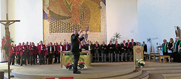 Die Sängergemeinschaft Selb begrüßt viele Gäste bei ihrem Frühlingssingen in der Herz-Jesu-Kirche. Der Erlös kommt traditionell wieder der Aktion "Misereor" zugute. "Es tönen die Lieder, der Frühling kehrt wieder": Die Freude darüber war beim Frühlingssingen der Sängergemeinschaft Selb in der Herz-Jesu-Kirche zu hören und zu spüren. Mehr als achtzig Sänger und Sängerinnen der Selber Chöre hatten den herrlichen Maisonntag mit Singen und Klingen begrüßt. Den musikalischen Frühlingsreigen eröffnete frisch und schwungvoll der Malergesangverein Selb und überbrachte eine Liebeserklärung an "My Fair Lady". Mit dem berühmten Song aus dem Musical von Frederick Loewe "...weil ich weiß, in der Straße wohnst du" hatte der Leiter des Malergesangvereins, Jürgen Tröger, gleichzeitig Lust auf die bevorstehende Luisenburg-Festspielsaison geweckt. "In mir erklingt ein leises Lied, in mir klingt leise eine Weise" von Manfred Bühler stimmte sanft der Kirchenchor Herz Jesu an, geleitet von Vera Sakowski und begleitet an der Orgel von Gerhard Kießling. Der Ruf: "Jeder Tag, er schenkt dir Freude, jeder Tag, er schenkt dir Glück", passte so recht zu diesem sonnigen Frühlingsmorgen. Die Singing Friends des TUS Erkersreuth unter der Leitung von Andreas Tietze unternahmen einen Ausflug zum "König der Löwen". Mit "Can you feel the love tonight" bewiesen sie viel Gefühl für den englischsprachigen Songtext von Elton John und Tim Rice. Mitreißend temperamentvoll versteht es der Gospelchor St. Andrew Singers mit seiner Leiterin Constanze Schweizer-Elser, die Frohe Botschaft im Musikstil afroamerikanischer Christen zu vermitteln. Beim Traditional "Mamalyie" sind Herz, Hände und Füße in Bewegung. "Sing mit mir", forderte der Gesangverein Thalia mit seinem Leiter Christian Metz auf und vermittelte den Besuchern Freude mit Musik, die zum Herzen dringt. Mit starkem, anhaltendem Applaus dankte die Festgemeinde für den bunten musikalischen Frühlingsstrauß. Zum Mitsingen eingeladen hatten schließlich alle Chöre beim fröhlichen Frühlingslied "Es tönen die Lieder". Ein herzliches "Vergelt's Gott" richtete Hausherr und Dekan Hans Klier an die Chorgemeinschaft, die auch den vorangegangenen festlichen Gottesdienst begleitet und umrahmt hatte, an die Chorleiter und Vorstände, die Musiker und Christian Metz, in dessen Händen die Gesamtleitung lag. Die Spenden beim Frühlingssingen kommen der Aktion "Misereor" zugute. Dekan Klier dankte für alle Gaben: "Sie dienen den Menschen, die nicht auf der Sonnenseite des Lebens stehen." Text/Bild: Hanna Cordes