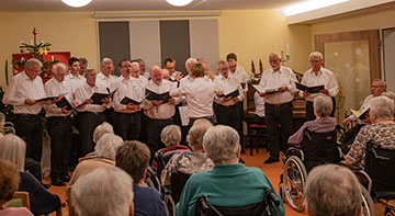 Der Malergesangverein 1887 Selb beim vorweihnachtlichen Konzert im Haus Perlenbach in Schönwald. Mit einigen schönen weihnachtlichen Liedern im Gepäck besucht der Malergesangverein 1887 Selb kurz vor Weihnachten die Senioreninnen und Senioren im BeneVit Haus Perlenbach in Schönwald. Die vielen Senioren warteten bereits voller Vorfreunde im Veranstaltungsraum auf die Sänger des Malergesangverein Selb um Chorleiter Jürgen Tröger. Heimleiterin Carmen Krone vom Haus Perlenbach begrüßte den Malergesangverein Selb und wünschte allen ein schönes Konzert. Es erklangen traditionellen Weihnachtslieder wie „Es ist ein Ros entsprungen“, „Schlaf wohl du Himmelsknabe“, „Oh du fröhliche“, „Singet, preiset und lobt unsern Herrn“, „Es freue sich die ganze Welt“ und „You Raise Me up“, bei denen mit gesummt oder mitgesungen wurde. Es herrschte eine andächtige, vorweihnachtliche Stimmung im Haus Perlenbach in Schönwald und viele die Seniorinnen und Senioren strahlten um die Wette. Der Malergesangverein Selb bedankte sich bei Carmen Krone für die Einladung und wünschten ein schönes Weihnachtsfest und ein gesundes und schönes neues Jahr 2020. Es war schön mit an zu sehen im Haus Perlenbach, dass man mit Singen, anderen eine Freude bereiten kann. Text/Bild: Uwe von Dorn